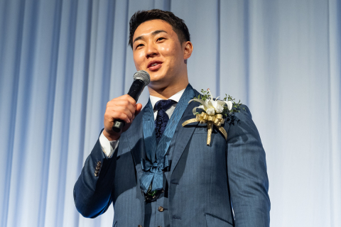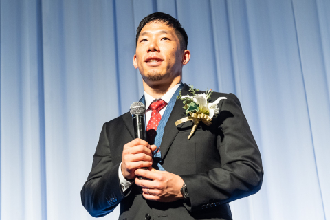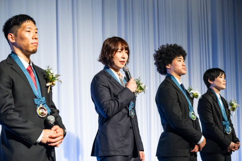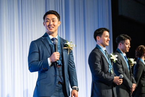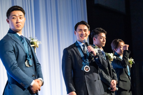 祝賀会の壇上に並んだ受賞選手達