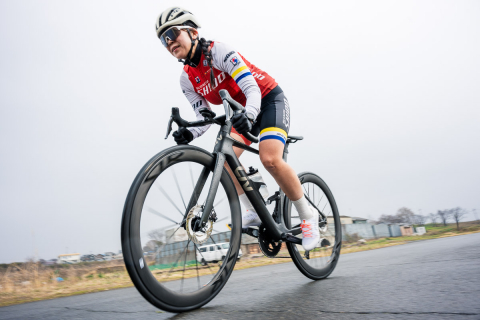途中までは女子オーストラリアチャンピオンのマッケンジー・クープランド選手(リブアルウラー・ジェイコ)にひたすら食らいつく。ペダリングが綺麗photo:Yufta Omata