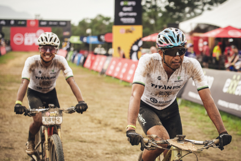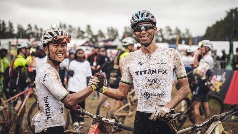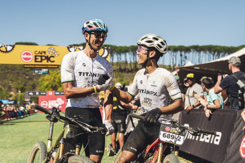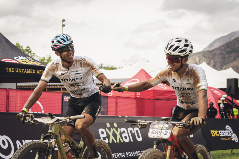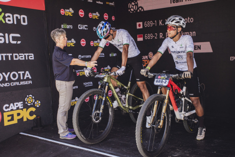 2位のタイムでフィニッシュするプロローグを走る山本幸平とリアッド・ハキム(Team Titan FX)