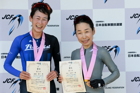男子マスターズ50代+60代 山本裕昭(BONDS静岡サイクルRT、写真左)と西谷雅史(チームオーベスト)が先行
