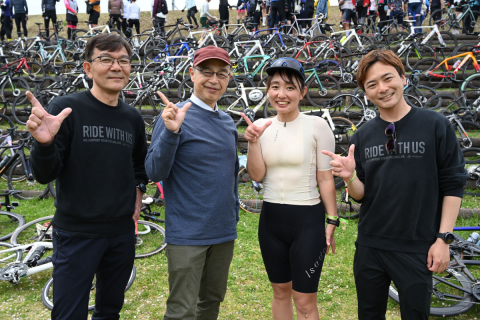 画像 イベントを主催するカミハギサイクルの上萩泰司社長(左)と小牧本店店長の裕太さん(右)、地元出身でイベントに協力するゆみやみさん(右から2番目)。この日は笠松町の古田聖人町長(右から3番目)も来場した photo:Masanori ASANO 2026/04/21 - 16:34