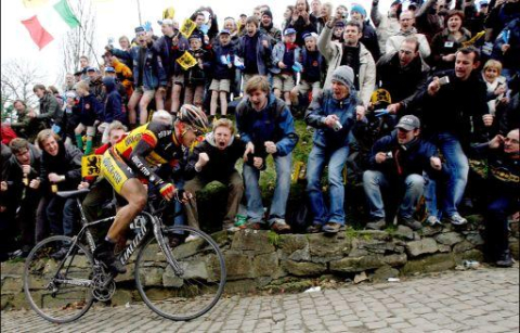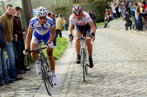 フランドルの名所ミュールを駆け上がるステイン・デヴォルデル(ベルギー、クイックステップ)