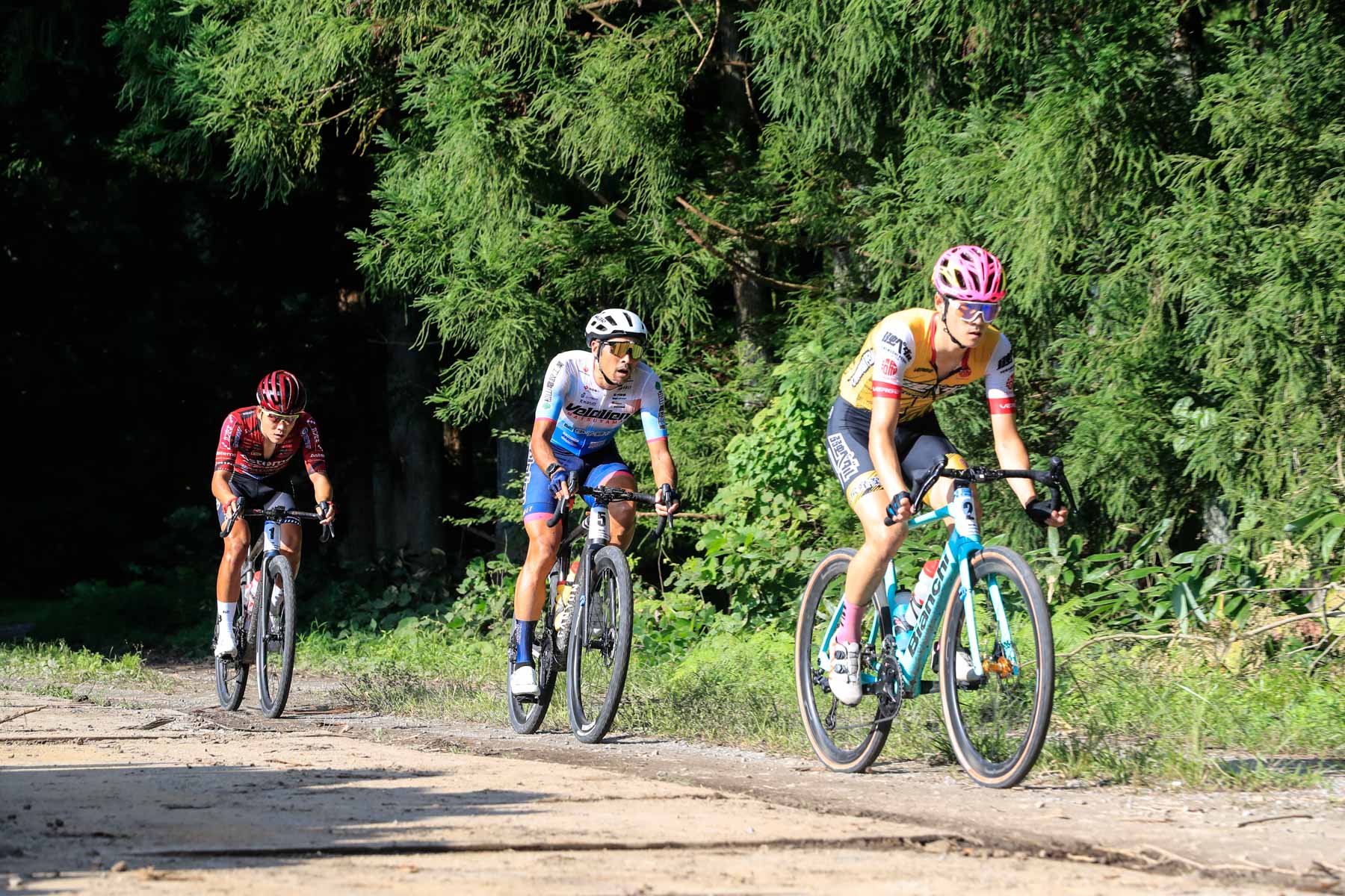 織田聖(弱虫ペダルサイクリングチーム)、阿部嵩之(ヴェロリアン松山)、沢田時(宇都宮ブリッツェン)の3人の先頭パック
