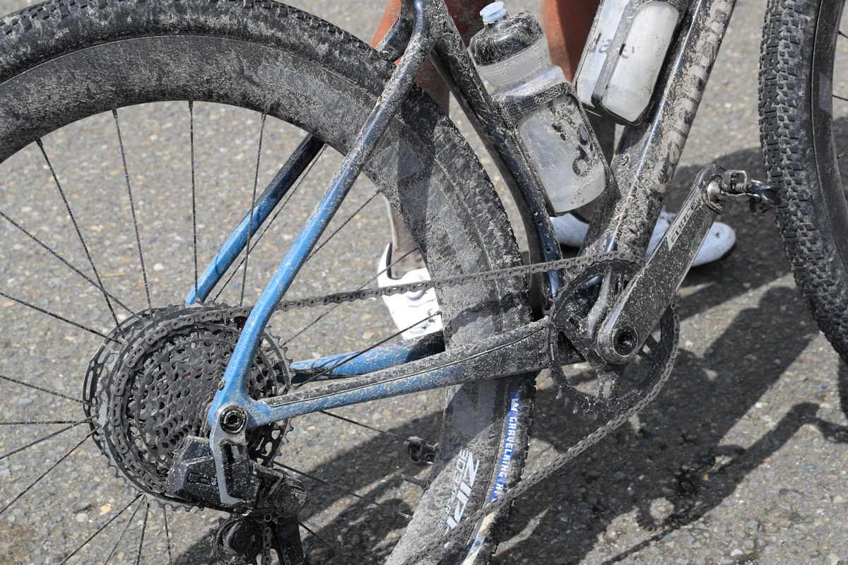 走り終えた直後のバイク。土砂降りの雨に降られて埃まみれに