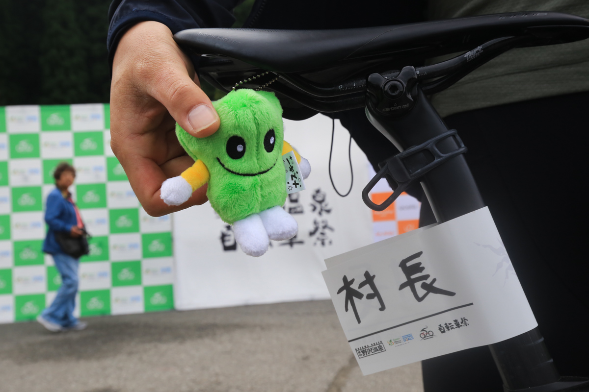 村長のサドルには野沢温泉スキー場のマスコットキャラクター「ナスキー」がぶら下がる