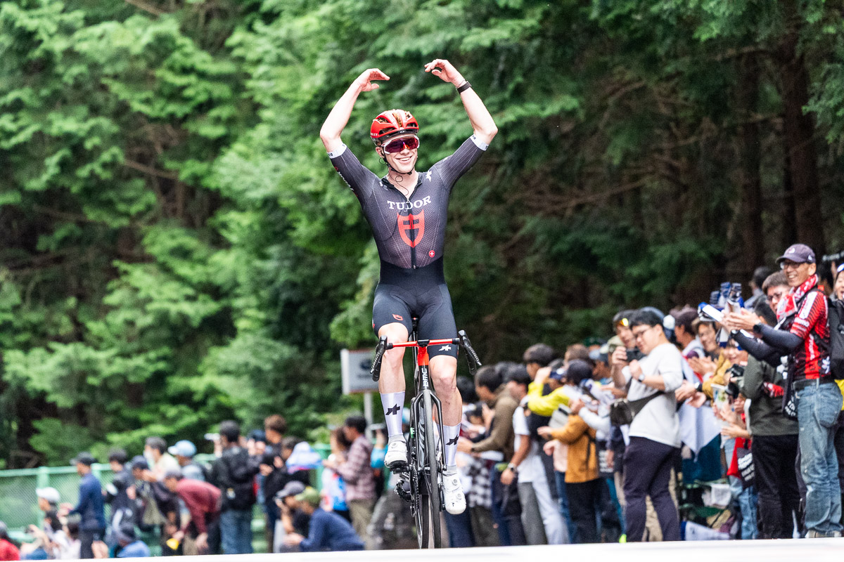 楽しそうに観客を煽りながらKOMへやってきたミカ・ヘミング(ドイツ、TUDORプロサイクリングチーム)
