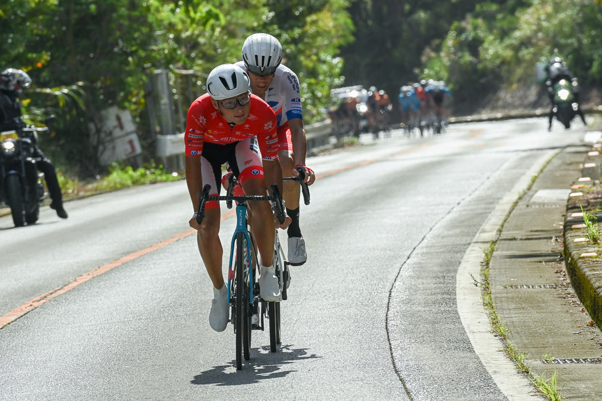 逃げる山本大喜(TEAM UKYO)とトマ・ルバ(キナンレーシングチーム)の後方に集団が迫る