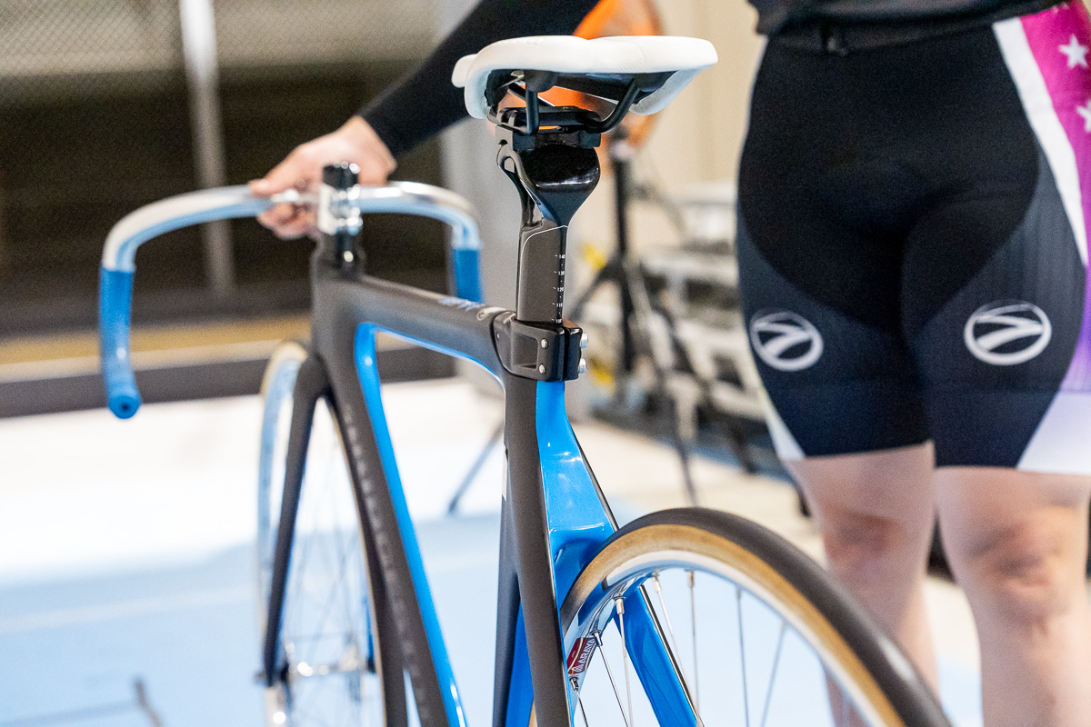 シートステーの後ろ側もブルーに塗られている。昨年のパールカップ等で使っていたシートポストは、このブルーが連続していた