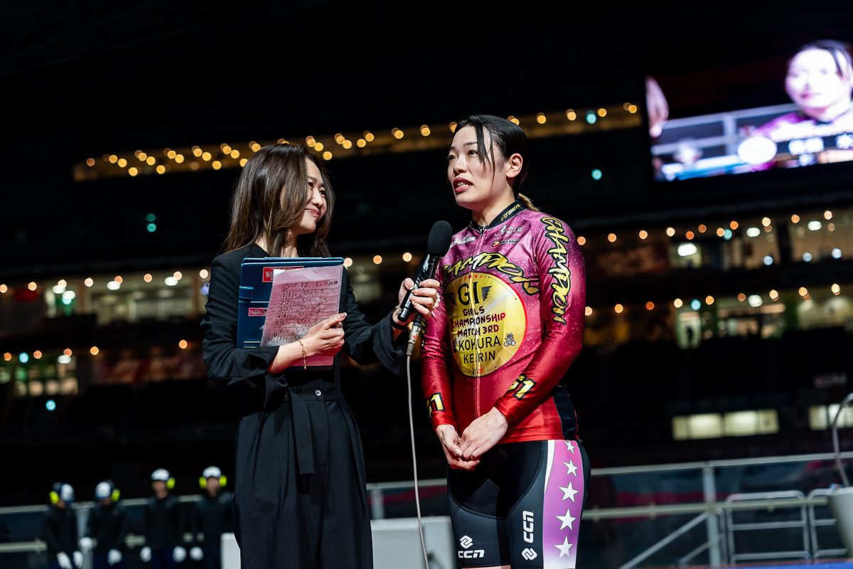 落車含みの決着にやや複雑な表情も浮かべながらインタビューに応じる佐藤水菜(神奈川)
