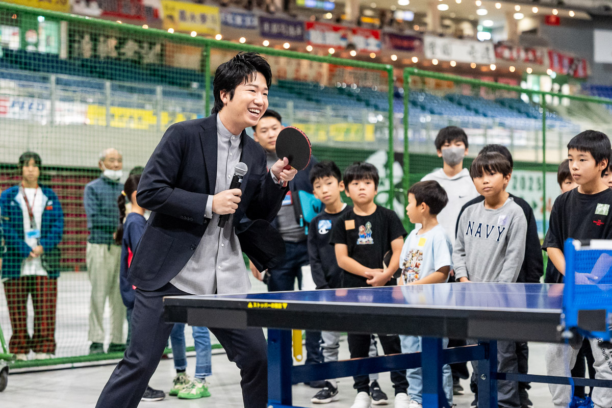 マイクを片手に一歩も動かず、基本のラリーを披露した水谷隼さん