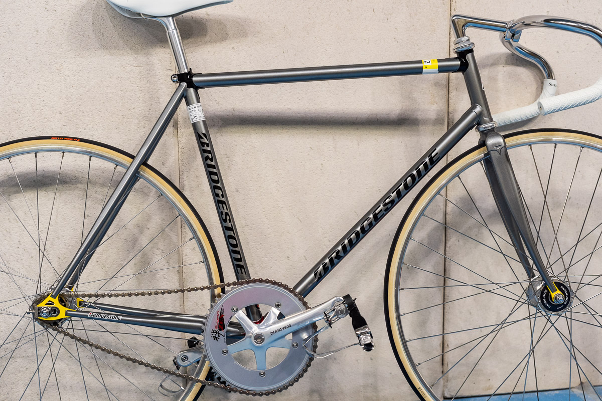 GT-Rのダークメタルグレーをメインカラーに、ブラックとイエローがバランス良く配されたブリヂストンのフレーム