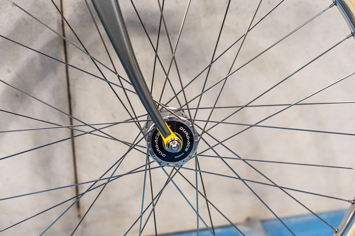 結線されたフロントスポーク。フォークエンドのイエローのワンポイントが映える
