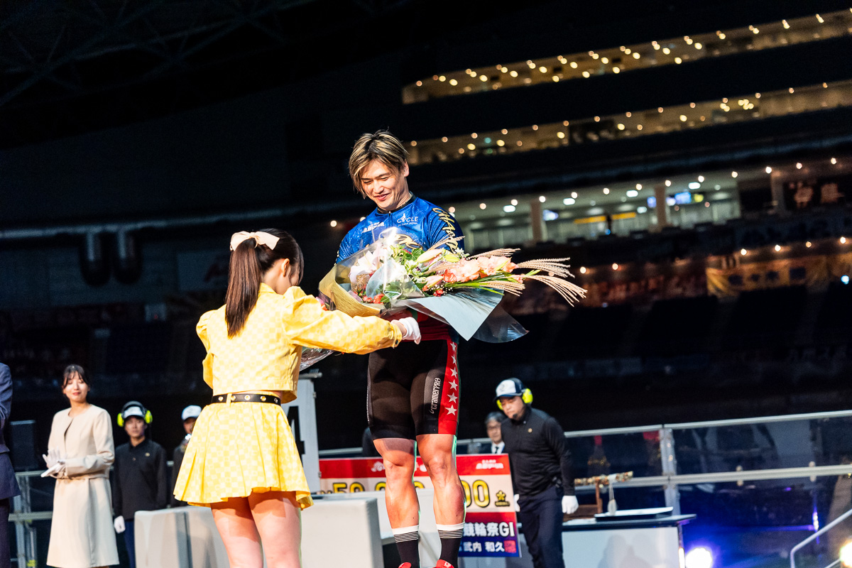 阿部拓真(宮城)が、スペースエンジェルから花束を受け取る