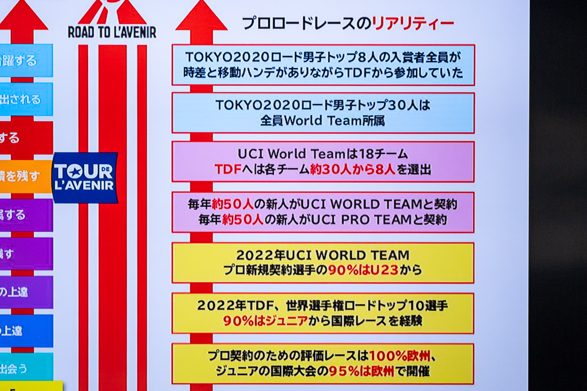 「プロ契約選手の90%はU23から」など、ロードレース界の実態が示された図
