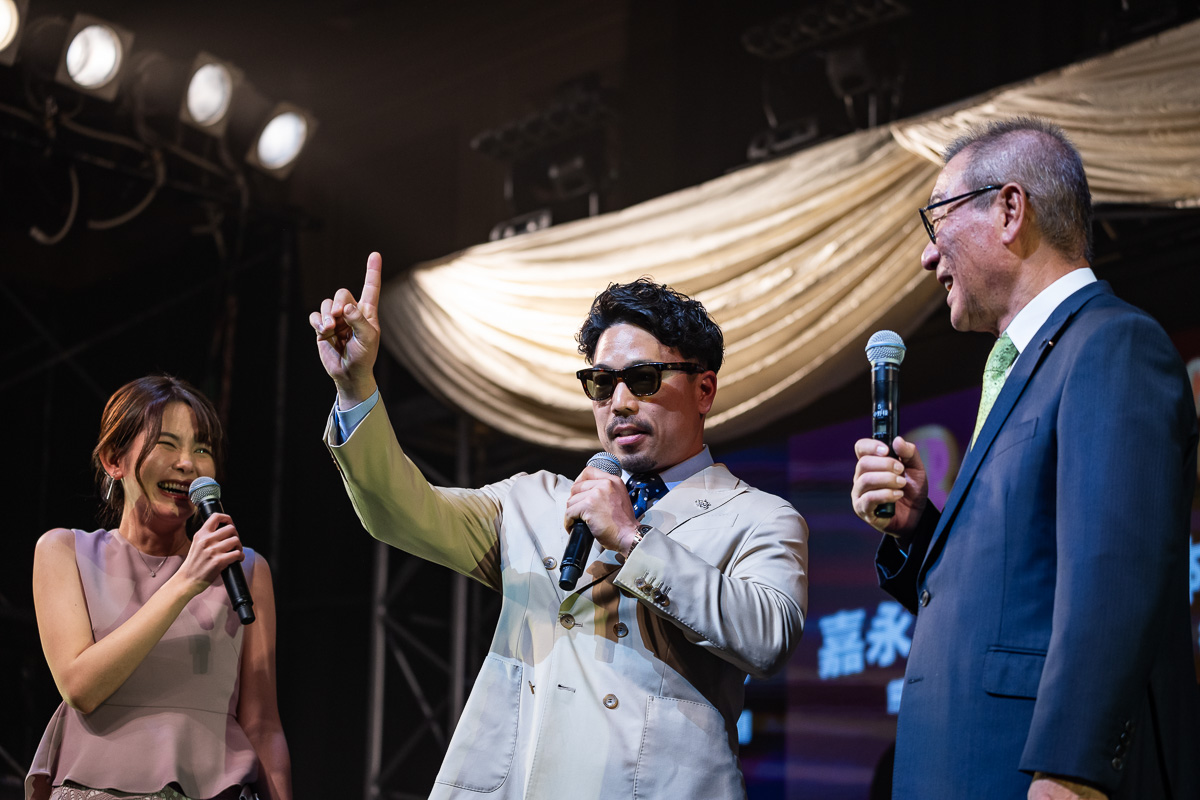 中野浩一さんに煽られ、サングラスをかけポーズを決める古性優作