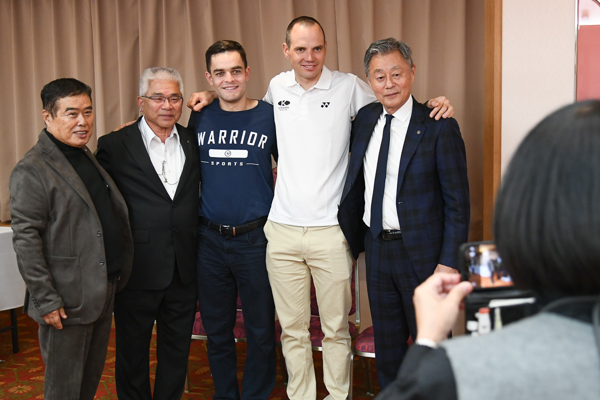左から、那智勝浦町の堀町長、レインタラマエ、ルーカス・カーステンゼン、古座川町の大屋町長、キナンの角口会長が記念撮影に収まる