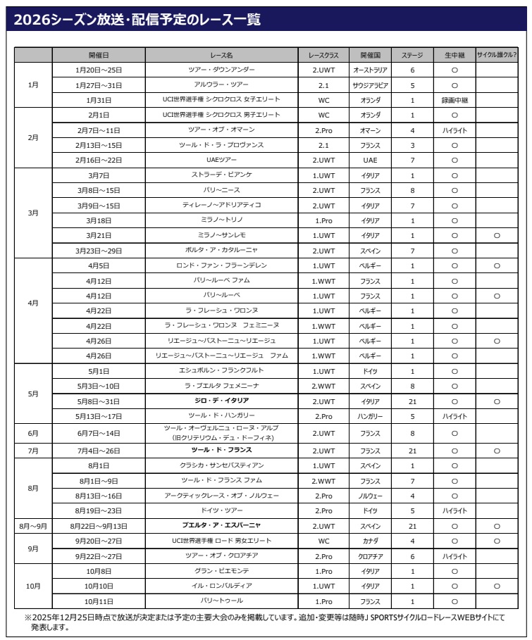 2026シーズン放送・配信予定のレース一覧