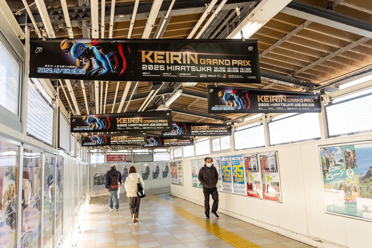 平塚駅南口へ続く通路にはKEIRINグランプリの横断幕が連なっていた