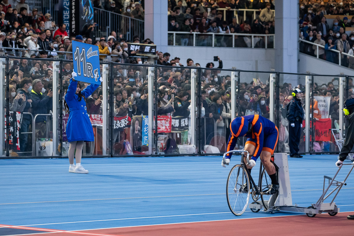 バンクエンジェルがレースボードを掲げ、先頭誘導員が準備を進める