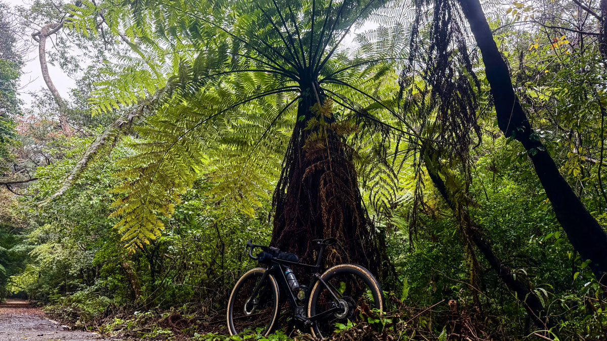 林道沿いに巨大なシダ植物が生い繁る