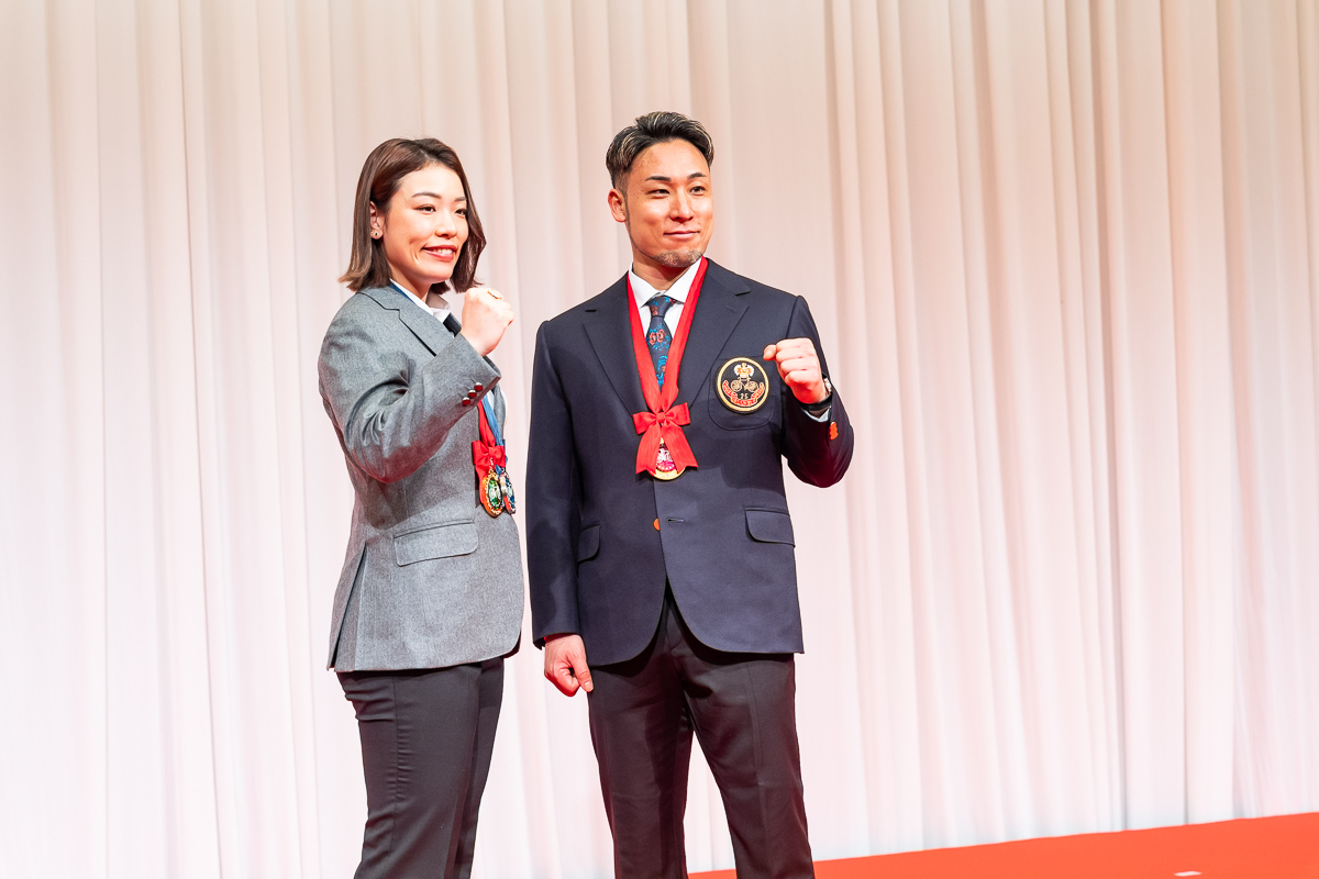 最優秀選手賞の郡司浩平(神奈川)と佐藤水菜(神奈川)がガッツポーズ