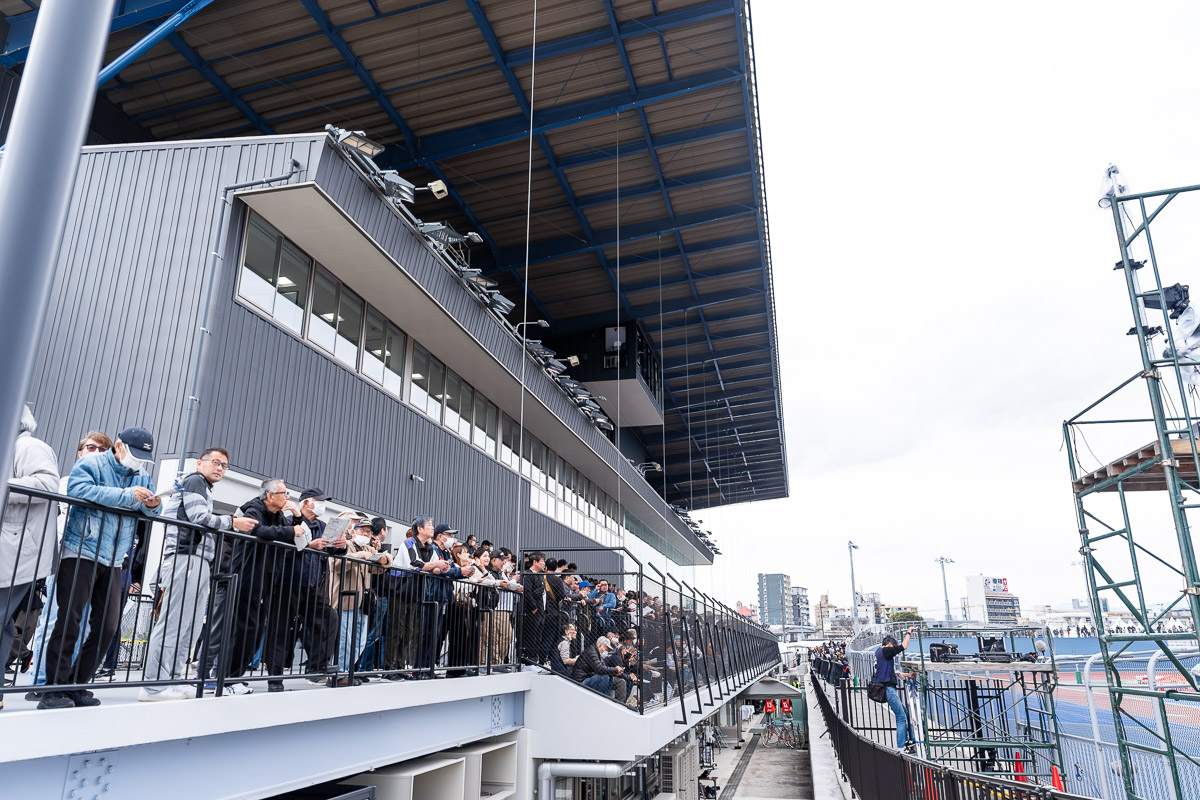 レース直前、人が一斉にバンク前に集まり、スタンドを埋め尽くす