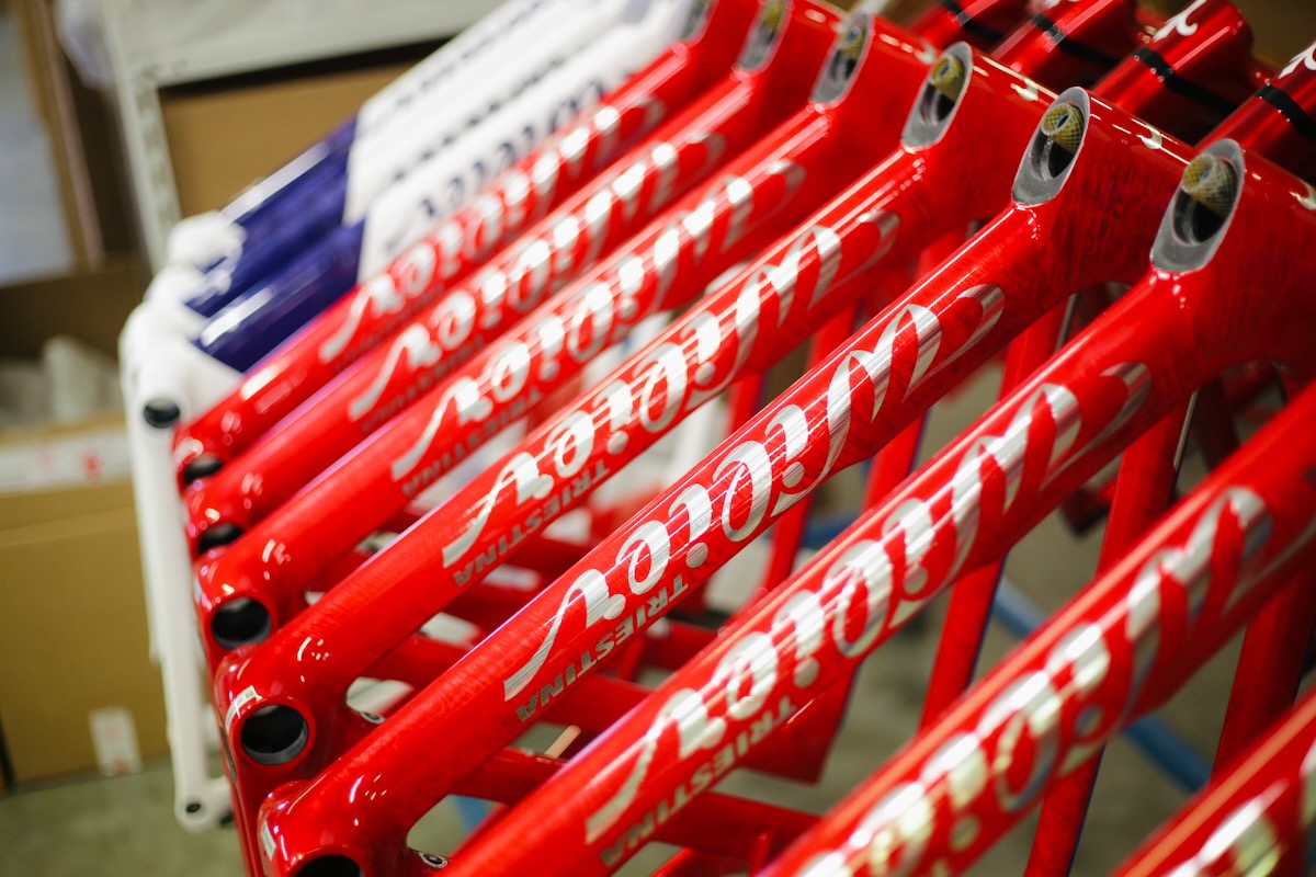 倉庫にはチーム用のバイクが並べられていた。特別塗装を行う職人の元から届いたばかりだという