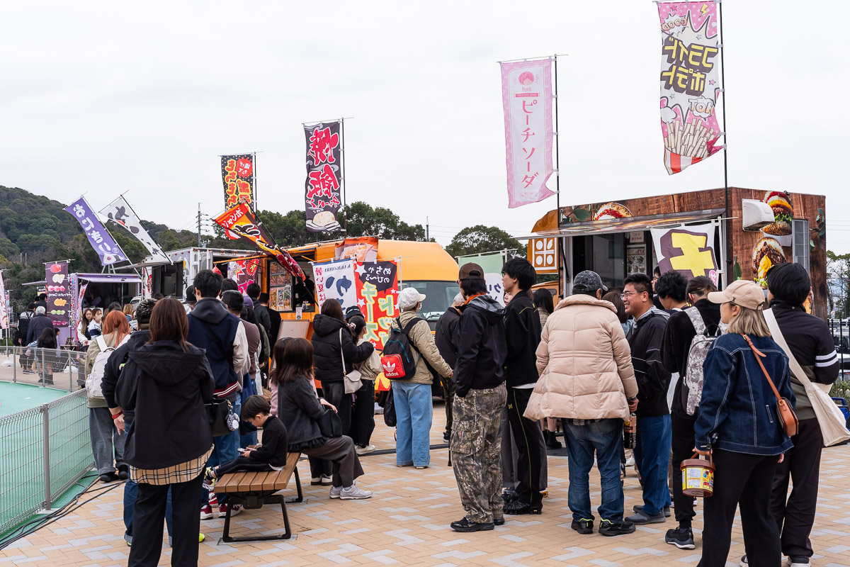 立ち並んだキッチンカーにはお腹を空かせたファンが行列を作った