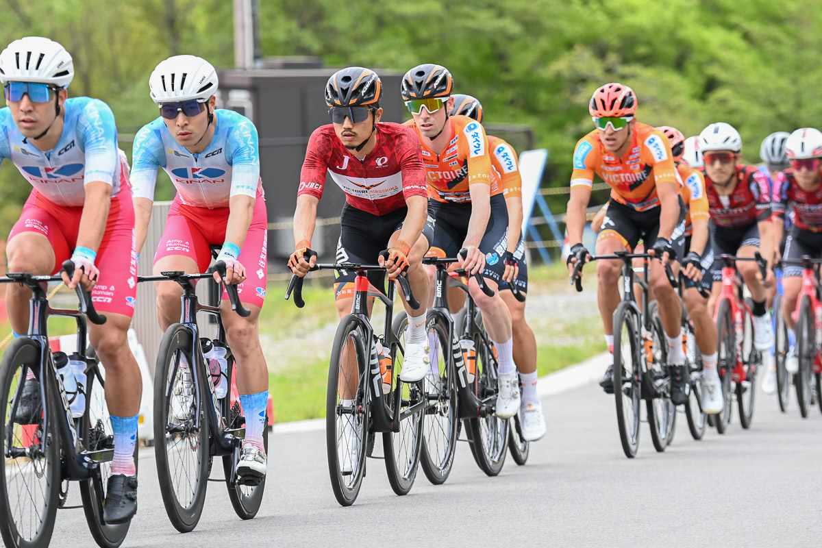 リーダージャージの孫崎大樹はヴィクトワール広島のメンバーを従えてキナンレーシングチームの後ろにつく
