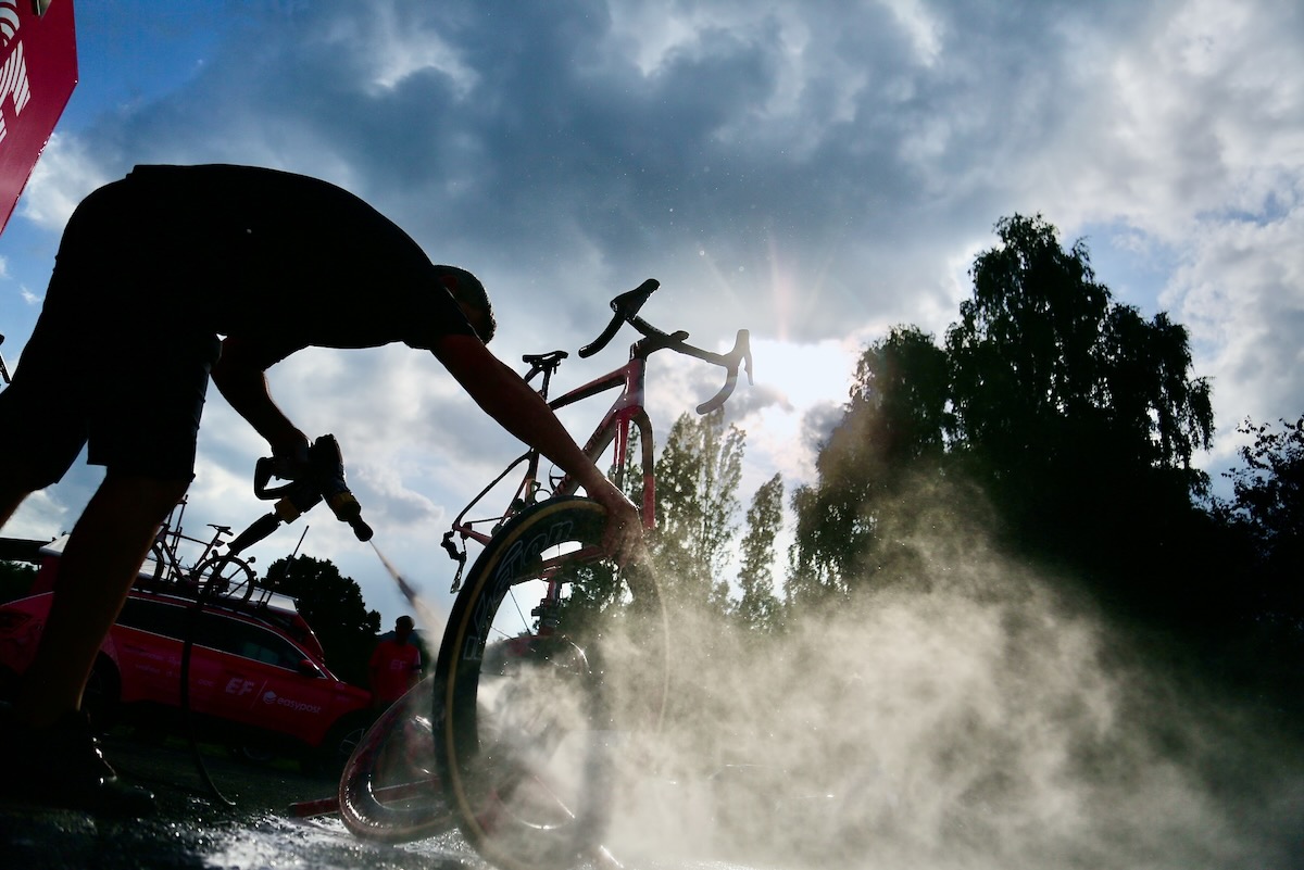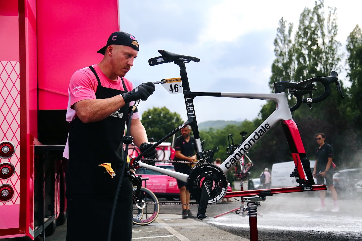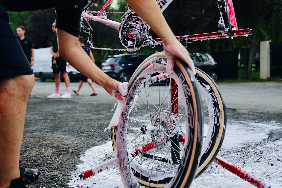 基本的にはまずチェーン周りをディグリーザー(DRIVETRAIN CLEANER)とブラシ(DRIVE TRAIN BRUSH)で洗い、次に電動ガンで「NANO TECH BIKE CLEANER」を吹きかけてスポンジで洗う。水で流したらすぐブロワで水分を飛ばし、各部へのオイル差し、締め付けの再確認、調整を行なって次のステージに備えるという流れ。ツールでは洗車1人、乾かし1人、整備に2人と合計4人のメカニックで流れ作業をしているんだ。