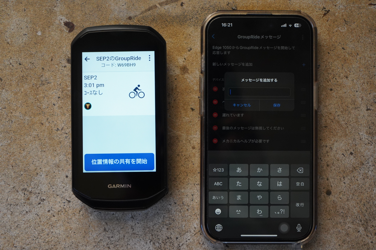 さらにグループ内全体にテキストを送れるメッセージ機能によって離れてしまった仲間とのやり取りも可能。デフォルトの簡易テンプレートだけではなく、ガーミンコネクトで作成した自分だけのテンプレート、そしてEdge 1050で手打ちしたテキストを送ることができるため、状況に応じたやり取りを行える。