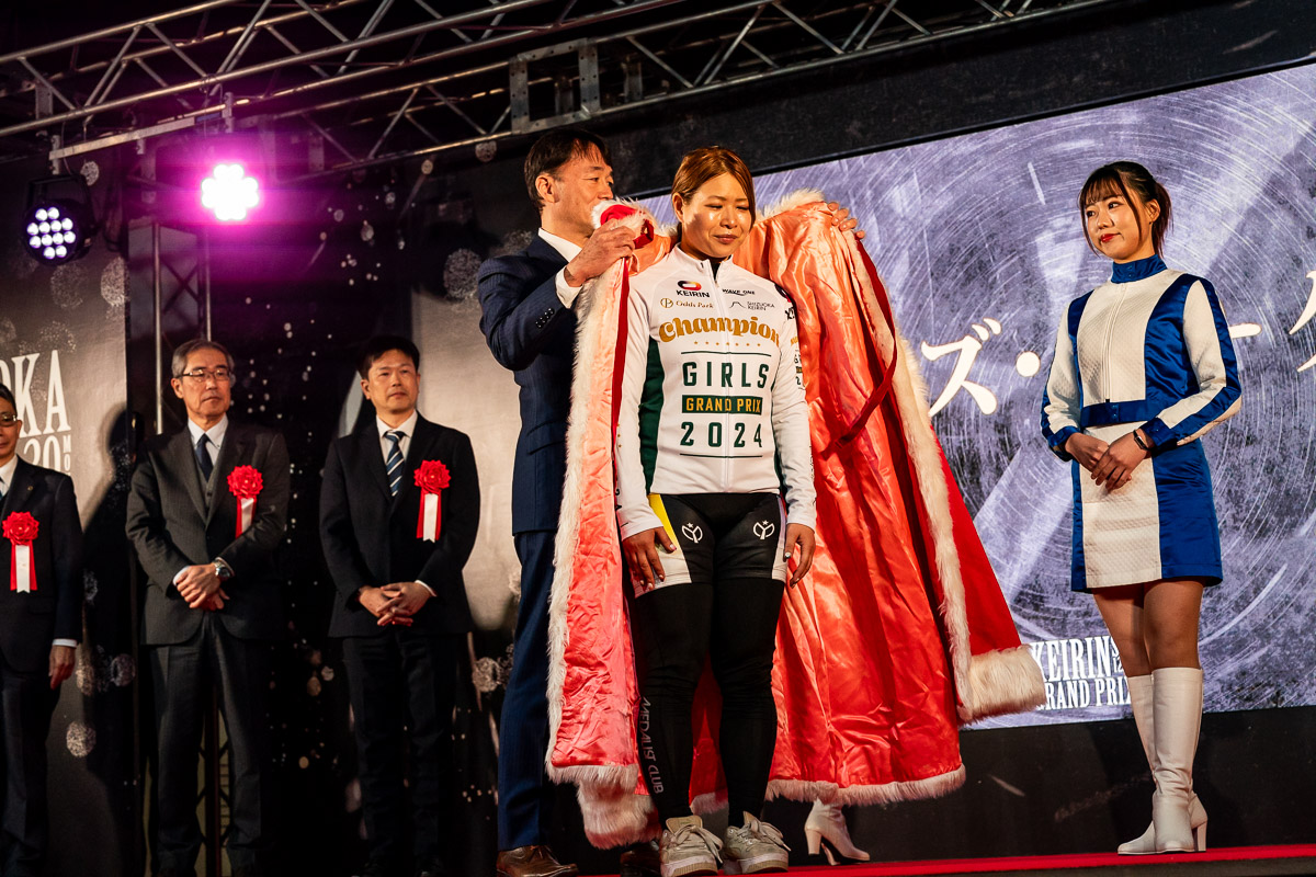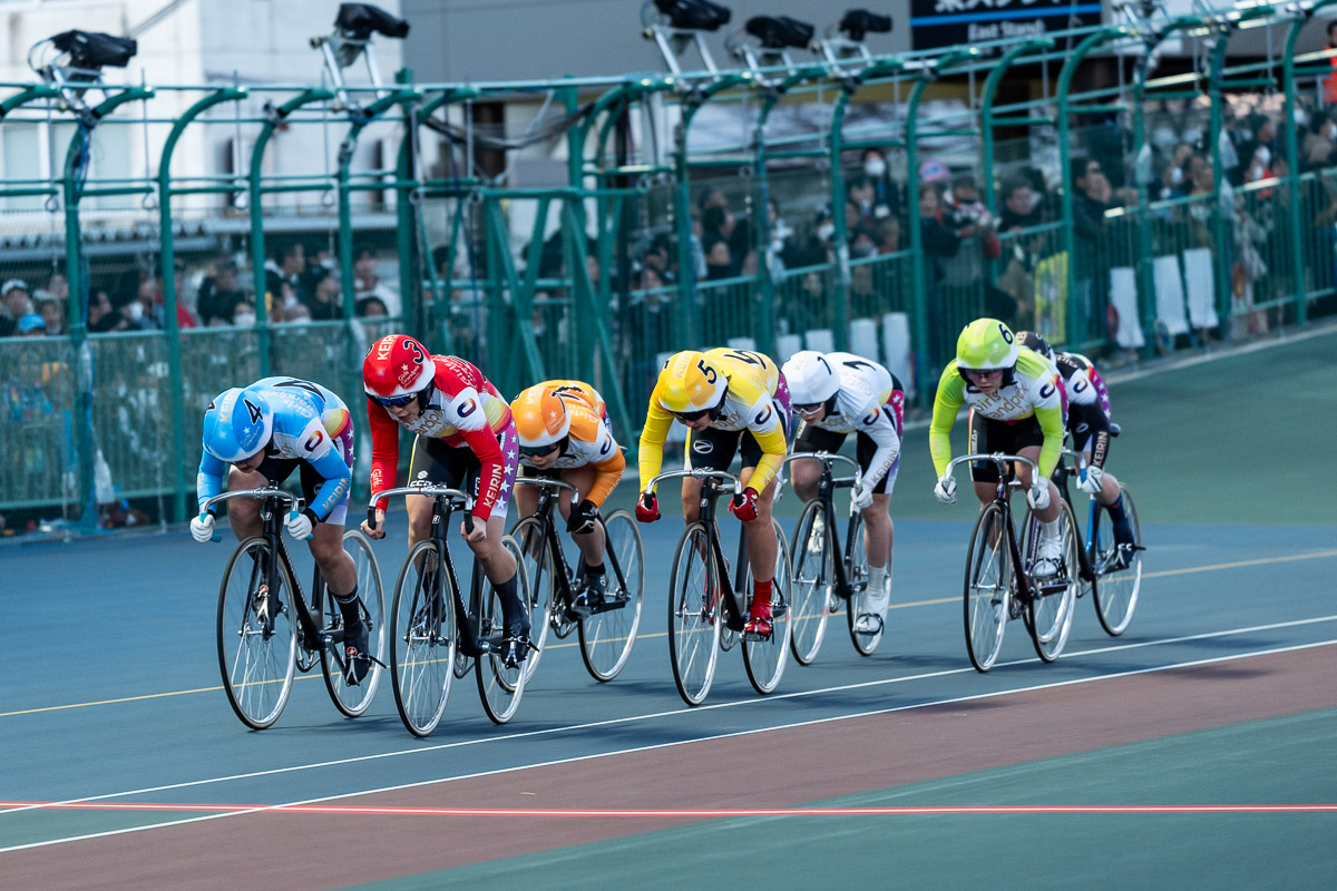 翌29日の最終レースとなったガールズグランプリ。いわゆる「鉄板」の一番人気に推されたのは、ケイリン世界王者・佐藤水菜(神奈川)。昨年の当グランプリを制した佐藤は今年、パリ五輪と世界選手権を目指し、ナショナルチームでの活動が中心であった。そのため11月時点で獲得賞金額がグランプリ出場圏に届いておらず、その月のGI・競輪祭女子王座戦で優勝することで当レースの出場権を掴み、3番車に収まった。これに対抗するのは1年間、国内で覇を競い合ってきたガールズのトップレーサー達。地元久留米のオールガールズクラシックを制した児玉碧衣(福岡)、パールカップ覇者・石井貴子(千葉)、グランプリ前の年間獲得賞金額トップの坂口楓華、今年のGIで3着2回のベテラン尾崎睦、最後のガールズケイリンフェスティバルでビッグレース初戴冠の尾方真生、2017年のガールズGP女王・石井寛子がスタートラインに肩を並べた。