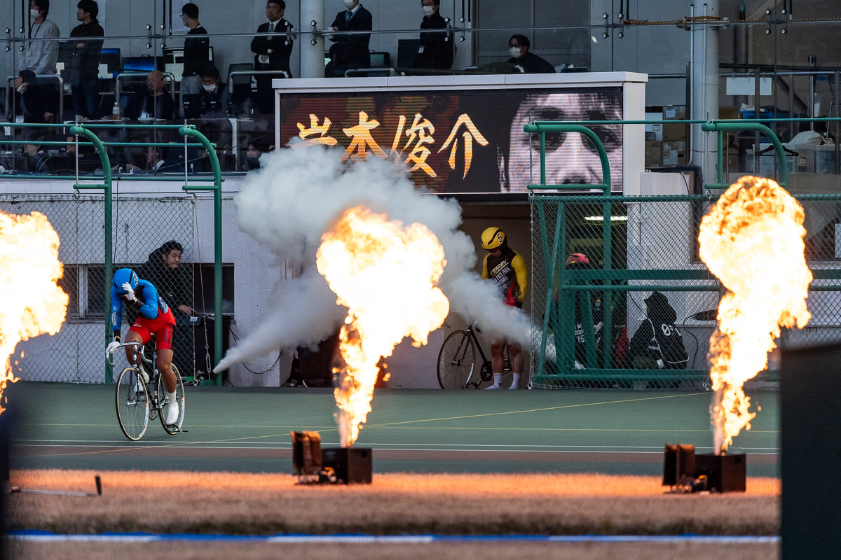 炎とスモークの演出を受けながら、KEIRINグランプリ出場選手が車番順に入場してくる photo: Yuichiro Hosoda