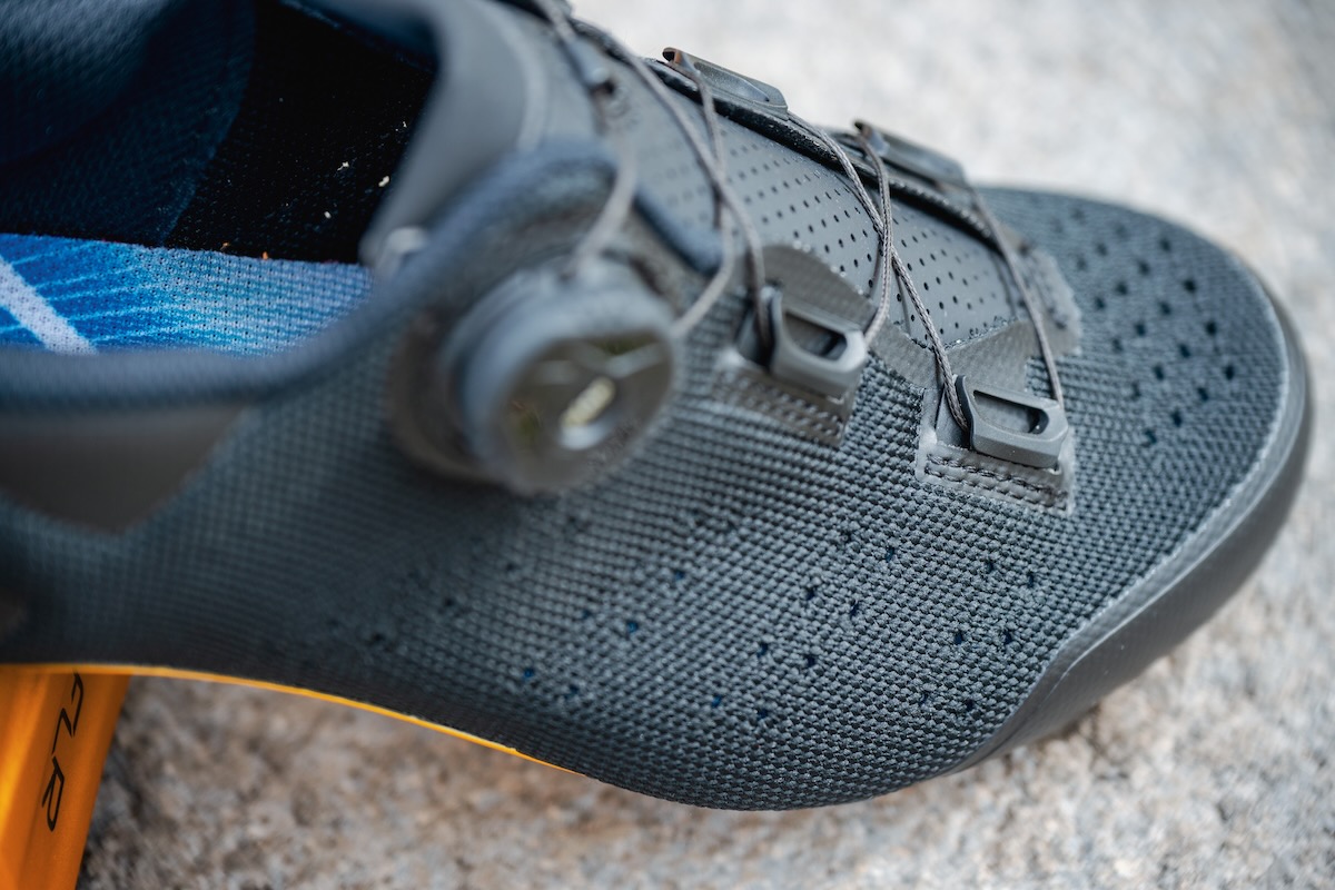 次にシューズの顔であるアッパーについて。多くのモデルで、マイクロファイバーとニットの2つの素材から選択可能だ。マイクロファイバーは近年のシューズにおけるベンチマーク的存在であり、通気性と耐久性、ペダリング剛性を高次元で両立する。汚れが拭き取りやすく、お手入れが簡単というメリットもある。一方ニットは伸縮性に優れ、素材ならではの長所がある。痛みの出にくい包み込むようなフィット感、夏場でも涼しい通気性、そして織り目の際立つ特徴的なルックスが魅力だ。