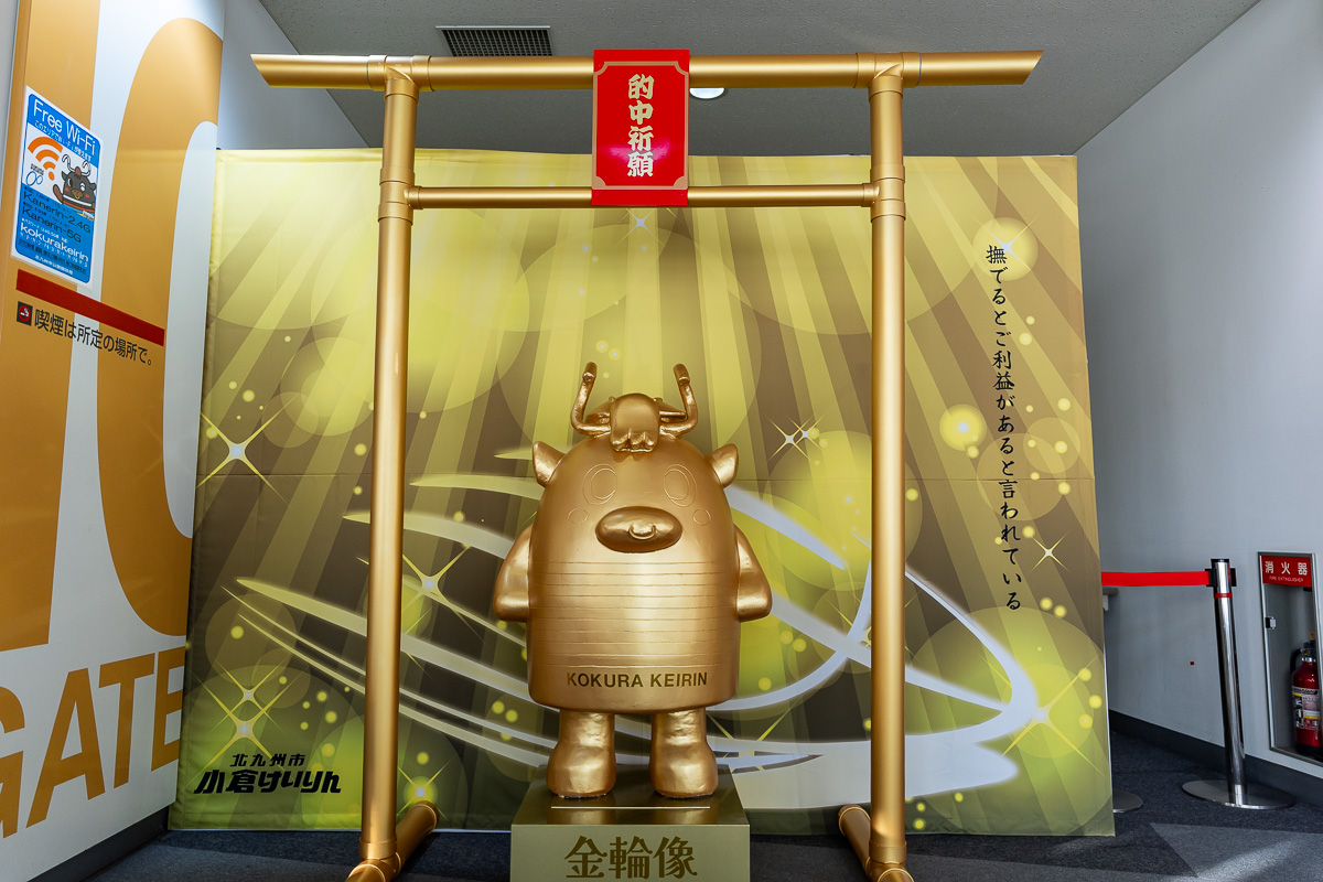 中でもひと際目立っていたのは、小倉競輪公式グッズ売り場の横に祀られていた、金色のかねりん。「金輪」と書いてかねりん(きっと本来の宛て漢字は「鐘輪」)。背景には「撫でるとご利益があると言われている」と書かれており、それを見つけた通りすがりの競輪ファン達が、優しく頭を撫でていく姿が何度も見られた。