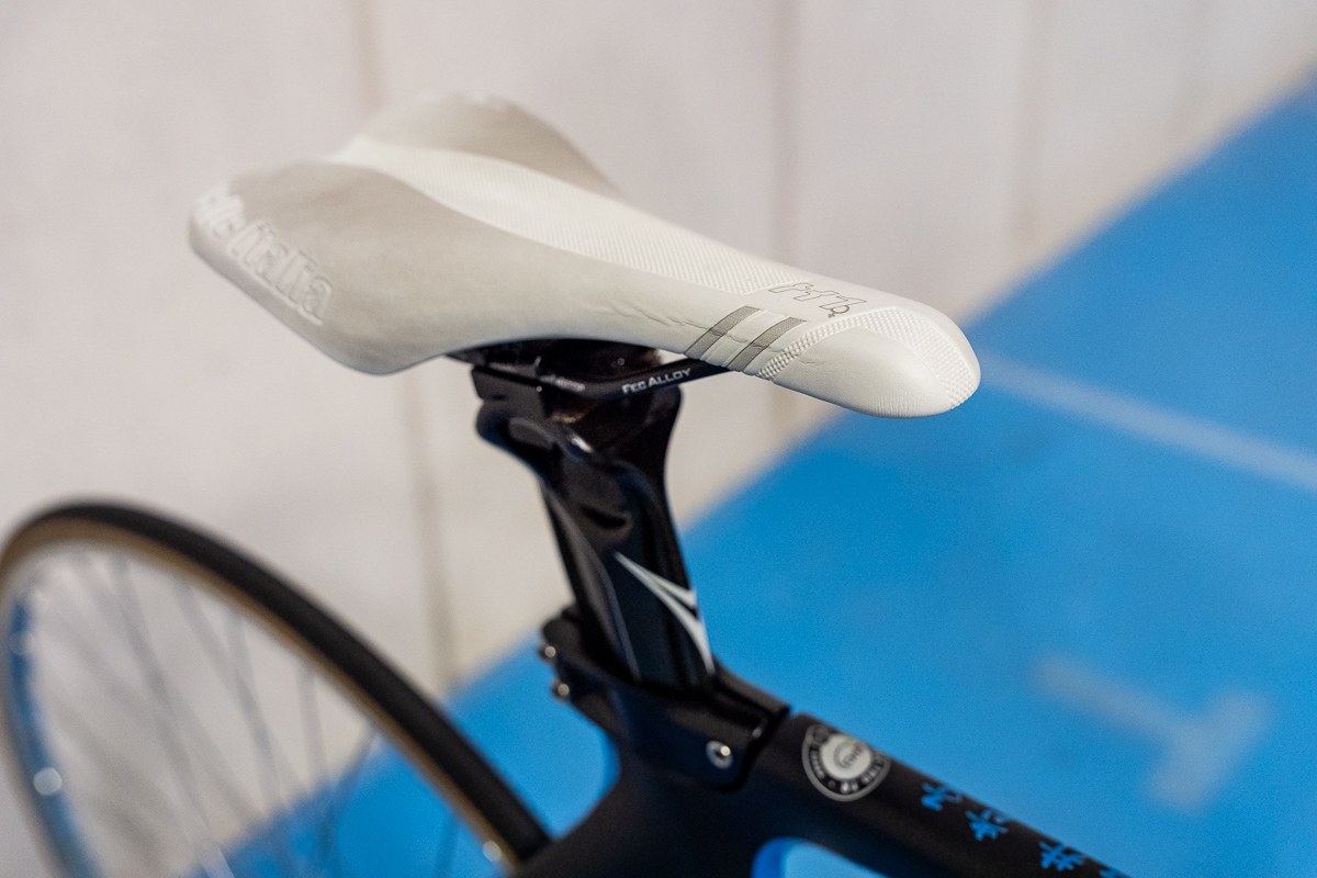 サドル周りとハンドル周りは今年の夏頃から変更をしていると言う。昨夏のパリ五輪後、ナショナルチーム勢が戻って来てスピードが上がったことに加え、30代半ばを迎えた身体に応じた変化が必要と感じたそうだ。「大工事になってしまって、ちょっとシンドいんですけど、頑張っております」と石井選手。