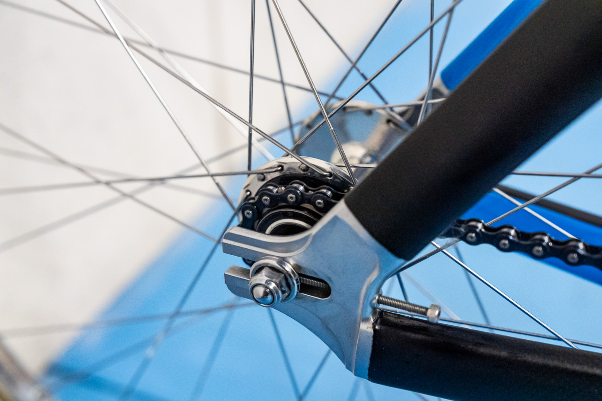 シートピラーは、今までの前後2点固定式の物から左右2点固定式の物に変更。以前の物はフレームのラインから続く形でブルーのラインが入っていたが、これは市販そのままの状態で、デザインの統一感が出せず、ちょっぴり悔しそうに話す姿が印象的だった。