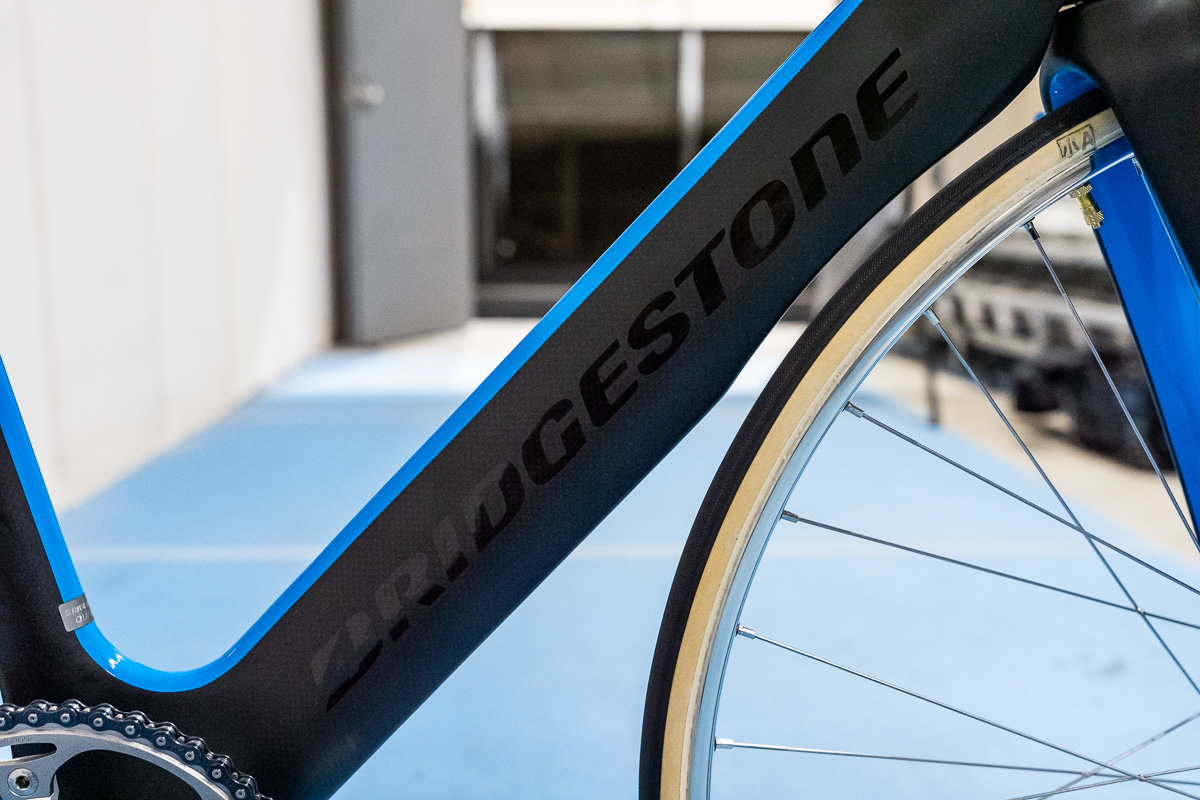 青の中でもちょっと濃いめが好きだと言うこの色、かつてチームスカイが駆ったピナレロDOGMAを意識したそう。「あの感じをこれに載せるにはどうしたらいいかな?となって、予備のフレームにマスキングテープを貼って一回この色で作ってみて、いろんな方向から写真を撮って、A4用紙3枚くらいに色々書き込んでブリヂストンに送りました」と実現の経緯を話してくれた。