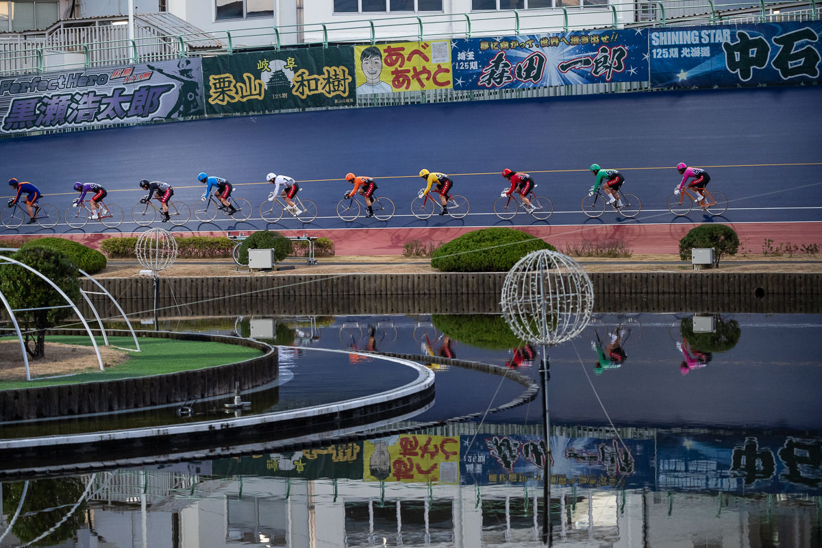 梶原海斗(福岡)が森田一郎(埼玉)の横へと迫り、赤板周回に入ると同時に先頭誘導員が退避していく photo: Yuichiro Hosoda