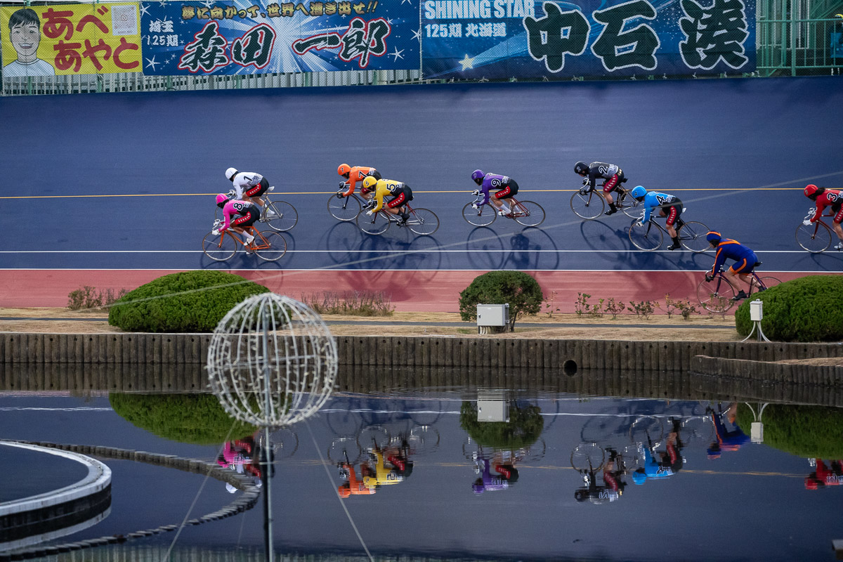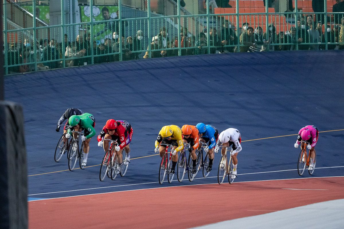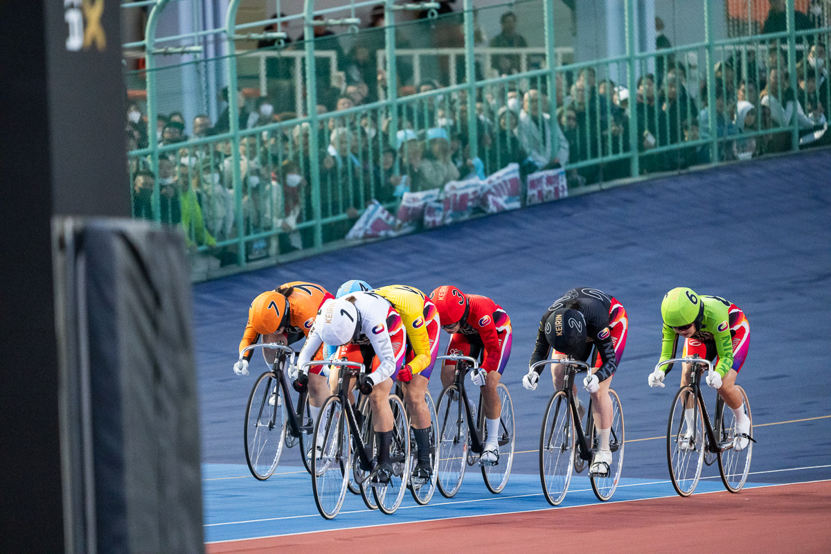 ジャンが鳴り出すと、一旦3番手に引いた梶原が再び仕掛ける。コーナーをクリアして最終周回へのホームストレッチ半ばで再び先頭に。関東2車を引き連れた森田は、この時点でも動けず、5番手のまま最終周回を迎える。