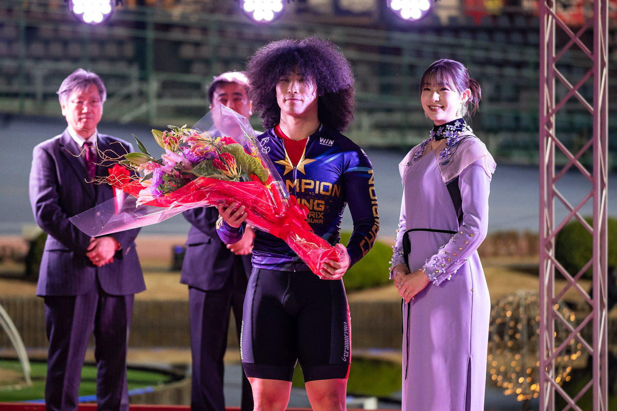 平塚競輪場アンバサダーの篠崎愛さんに花束を贈られ、共に写真に収まる中石湊(北海道) photo: Yuichiro Hosoda