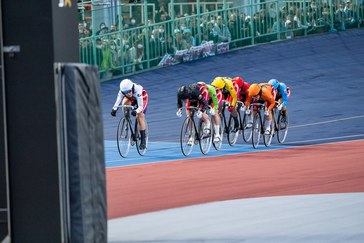 梶原海斗(福岡)が先頭で最終バックへと突入。後方からは赤い3番車の中石湊(北海道)が一気の捲り photo: Yuichiro Hosoda