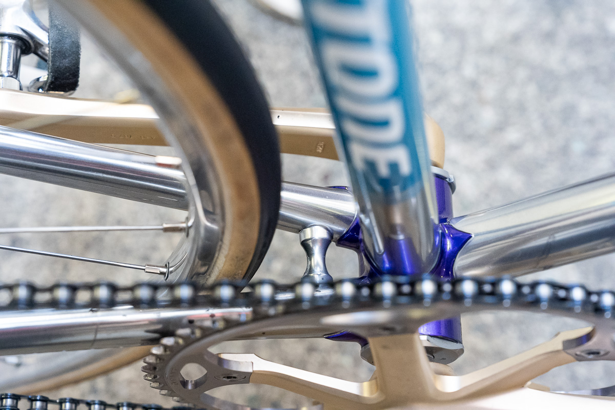 様々なビルダーのバイクを乗り継ぐ選手もいるが、松本選手は競輪学校(現:日本競輪選手養成所)時代からブリヂストン一択。「これまでハンガー下がりを変えたり、シートステー長を変更したり、サイズは同じままパイプを変えたりしましたが、デビューから大きくバイクの方向性は変えていません。重いギアを踏み倒すよりは軽いギアを回す走り方で、脚質的には後半に粘るタイプ。フレームの乗り味もそれに合わせて工夫しています。」愛着あるフレームだが、さすがに傷が目立ってきたため、現在は新しいフレームの到着待ちだそうだ。