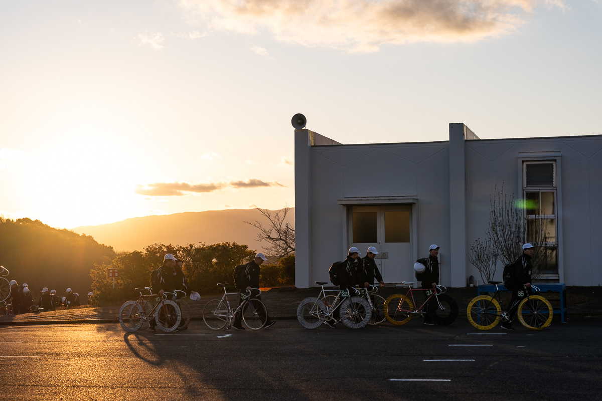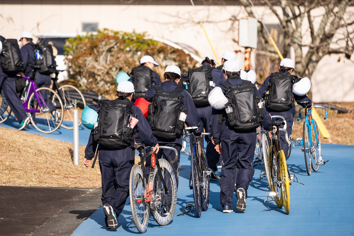 当記録会は初日、屋内250mバンクの「JKA250」にて女子は200mTTと500mTT、男子は200mTTと1000mTTが行われ、2日目の計測は、男女とも400mTTの1本。まずはウォームアップやバイク整備を終えた女子候補生達がバンクへとやって来た。候補生達は礼儀正しく、顔を合わせると皆「こんにちは!」と爽やかに挨拶をして通り過ぎて行く。しかし集団で来た場合は1対多になるため、こちらは何度も挨拶をすることになり、ちょっぴり大変だ(笑)。