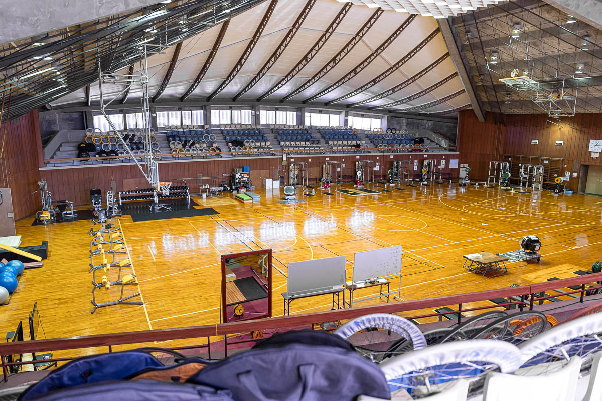 続いて再び坂を上り、教室棟の向かいにある体育館へと入っていく。入口では巨大なレッグプレスマシンが出迎える。中には様々な器材が壁づたいに点在しており、グルリと見渡すと壮観だ。巨大で何10kgと記されたプレート群を目の当たりにすると「競輪選手となるにはこれだけの物を持ち上げるパワーが必要なのか!」と思い知らされる。せいぜい20kg程度のダンベルでユル筋トレをするだけの筆者には、とても持ち上がりそうにない。自分と同じ50代になっても現役を続けている選手達の凄みも同時に理解出来た。