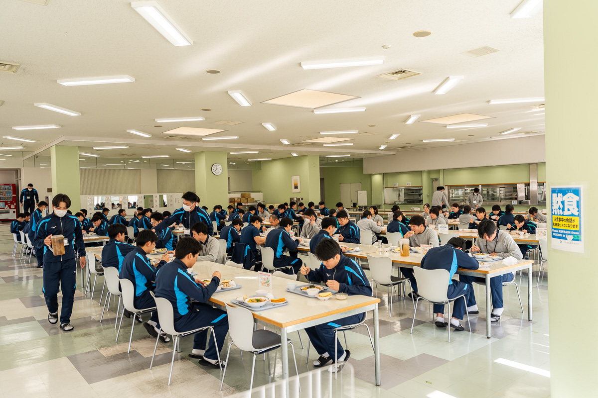 授業の見学を終えると、お待ちかねのランチタイム。宿舎1階にある食堂へ。一旦自室に戻った候補生達が、続々とやってきた。各自の席は予め決められているようで、お盆やカトラリーを手に厨房のカウンターの食事を受け取って着席するまで、滞ることなく候補生達が流れていく。風邪やインフルエンザが流行する時期とあり、黙食も徹底。食事も静かに進んでいった。