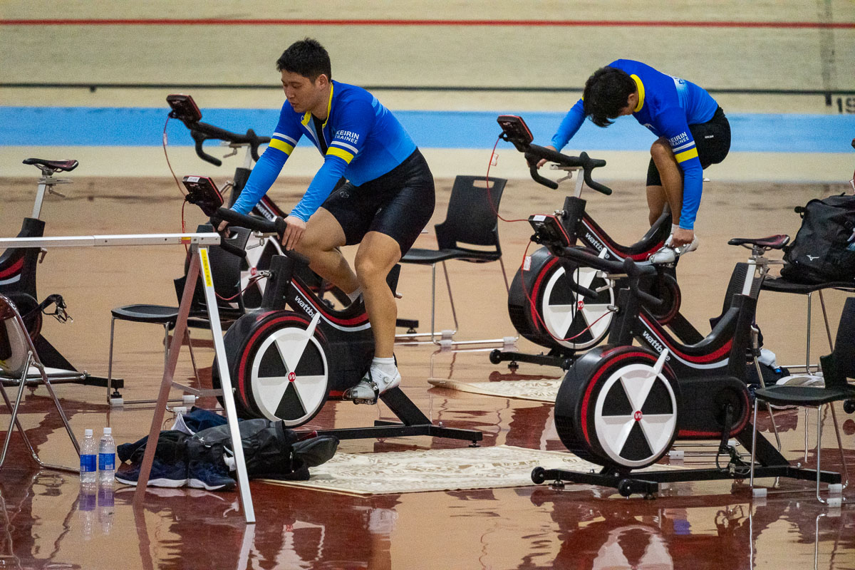 バンクのうち特に印象に残ったのはJKA250で、直線からコーナーに至る曲面がうねるように繋がっており、独特のクセがある。同じ250mでも伊豆ヴェロドロームとは違った走りの工夫が必要かもしれない。バンクの内側には何台ものワットバイクが配置され、この日は別カリキュラムと思われる2名の男子候補生がそのペダルを漕いでいた。333mピストは、教室棟や格納庫、体育館に隣接しており、最もアクセスが良い。こちらでは1人の候補生が、バイクペーサーによる訓練に取り組んでいた。