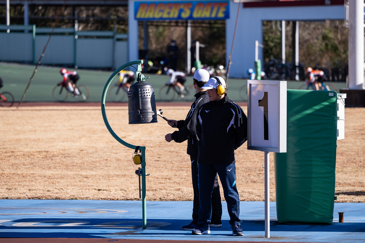 それが終わると女子、男子とも正式な競走用ユニフォームを着用して女子は7車、男子は8車あるいは9車で発走機に。打鐘や周回表示、発走機の出し入れは、女子競走中には男子候補生が、男子競走中は女子候補生が担当していた。こうしたスタッフ側の動きを実践する事も、学びの一環だ。