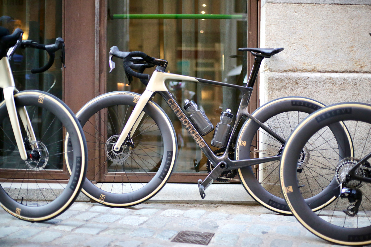 テストライドを待つSuperSix EVO Hi-Mod。シャンパンゴールドのフレームが街に映えていた (c)Brazo de Hierro Photography