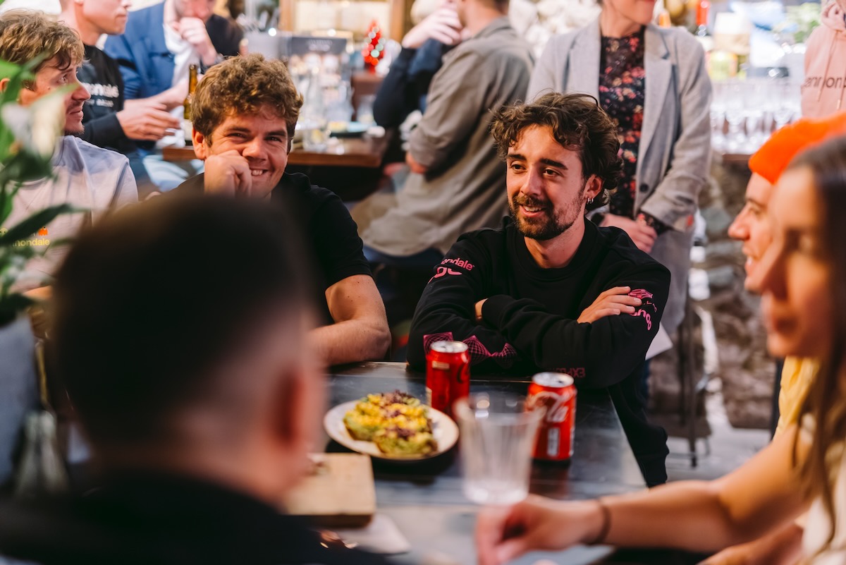 メディア勢と夕食を共にしたヒーリーたち。SuperSix EVOの乗り味に満足している様子だった (c)Brazo de Hierro Photography